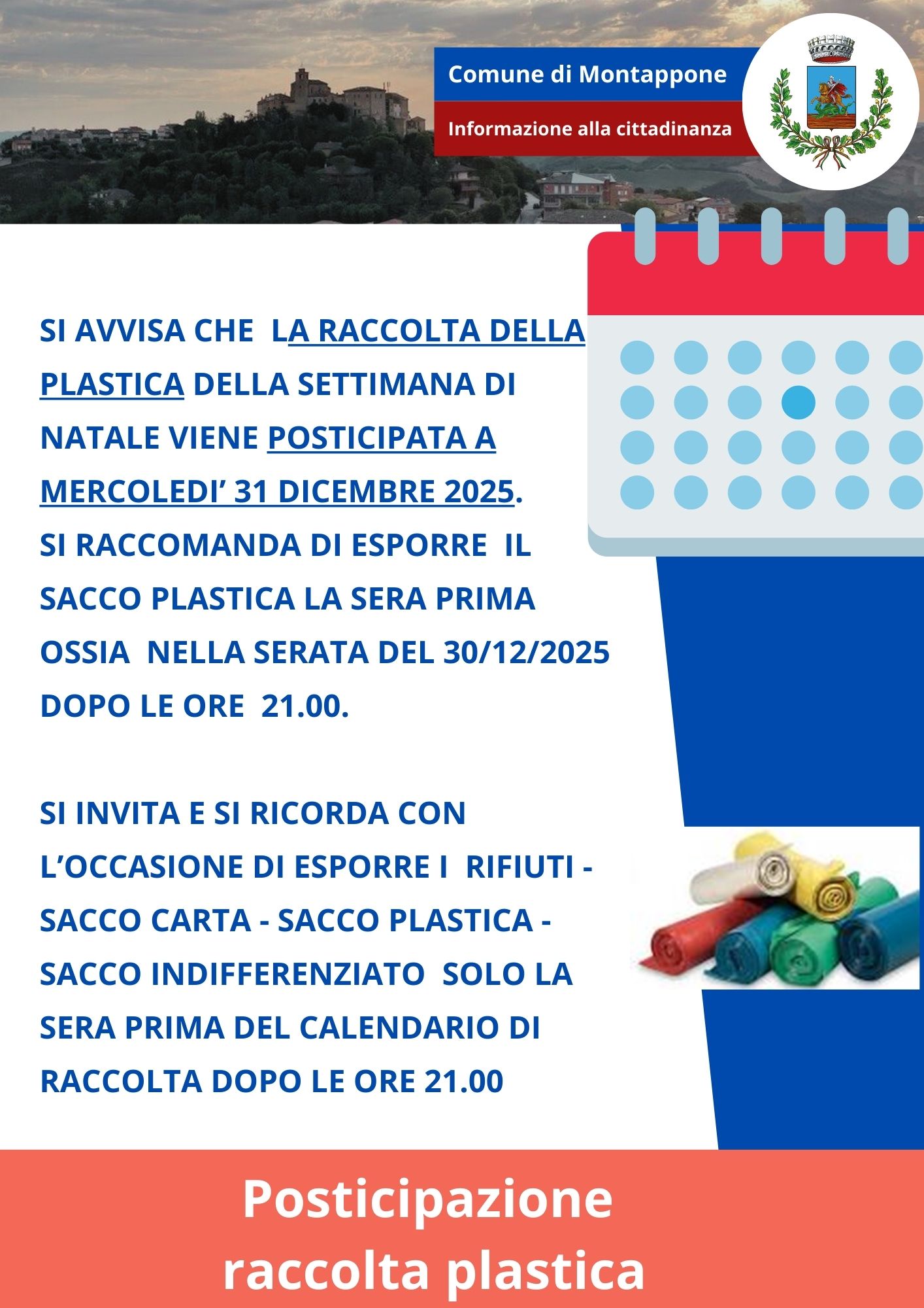 Raccolta della plastica posticipata a Mercoledì 31 Dicembre 2025