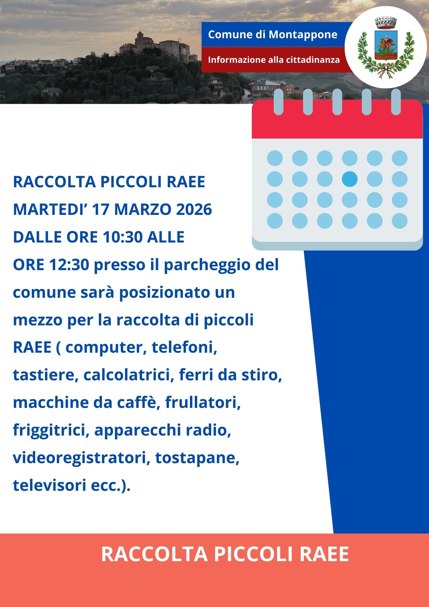 Si avvisa la Cittadinanza che martedì 17 Marzo 2026 dalle 10:30 alle 12:30 presso il parcheggio del Comune di Montappone sarà presente il furgoncino per la raccolta dei piccoli RAEE (computer, telefoni, tastiere, calcolatrici, ferri da stiro, macchine da caffè, frullatori, friggitrici, apparecchi radio, videoregistratori, tostapane, televisori ecc.).