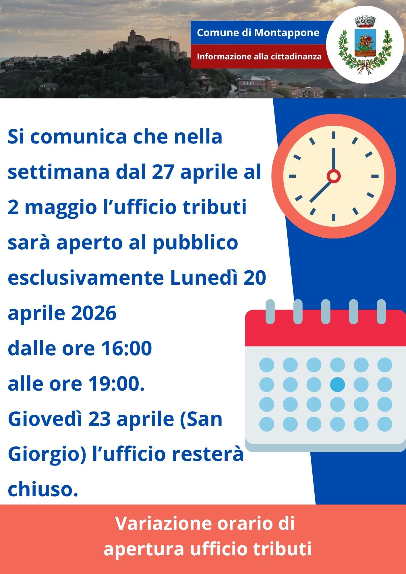 Si comunica che nella settimana dal 20 aprile al 2 maggio 2026 l'Ufficio Tributi sarà aperto esclusivamente Lunedì 20 aprile 2026 dalle 16:00 alle 19:00
