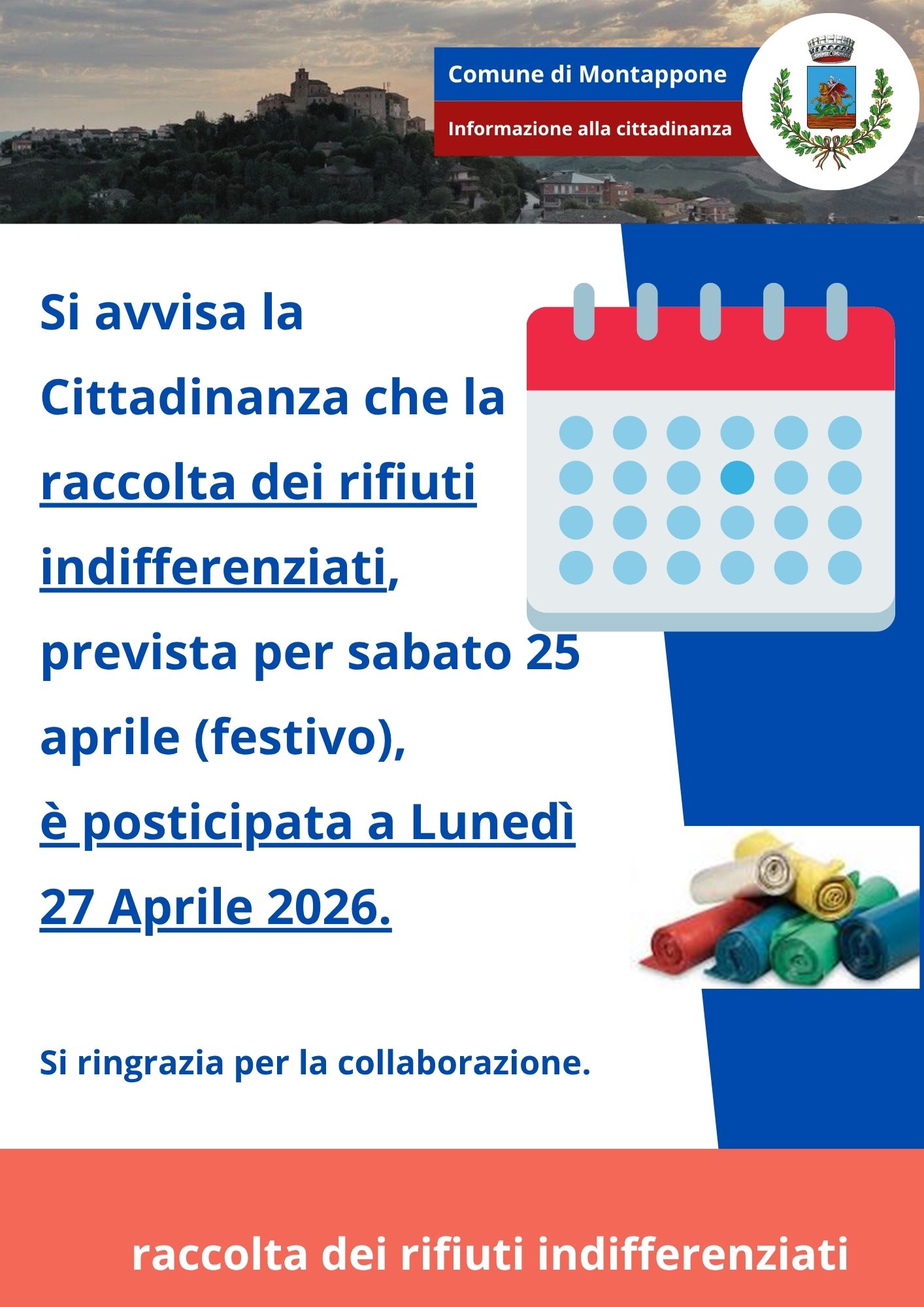 SI AVVISA LA CITTADINANZA CHE LA RACCOLTA DELL'INDIFFERENZIATA, PREVISTA PER SABATO 25 APRILE (FESTIVO), E' POSTICIPATA A LUNEDI' 27 APRILE 2026
