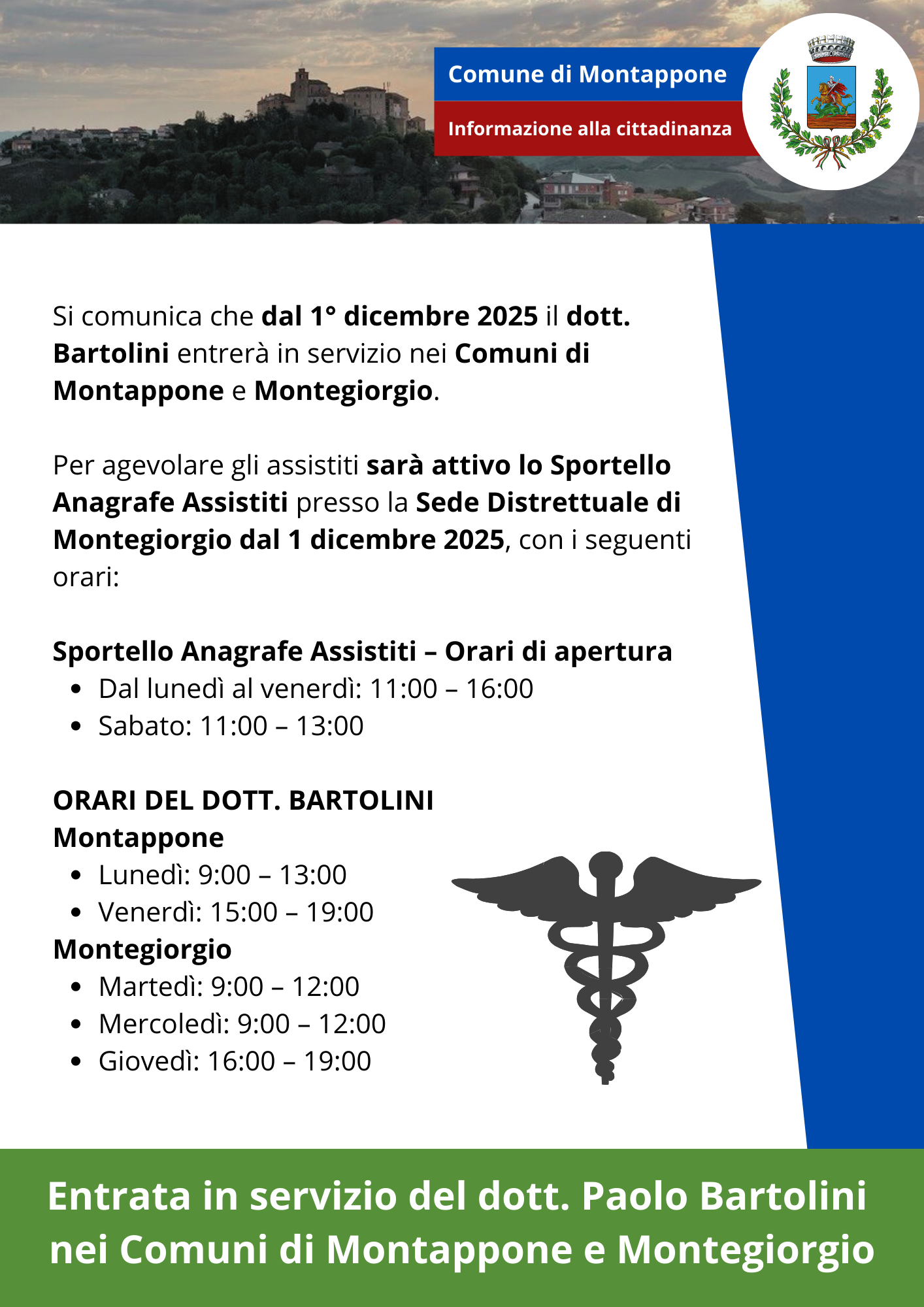 Dal 1^ dicembre 2025 il Dott. Bartolini Paolo entrerà in servizio nei Comuni di Montappone e Montegiorgio.