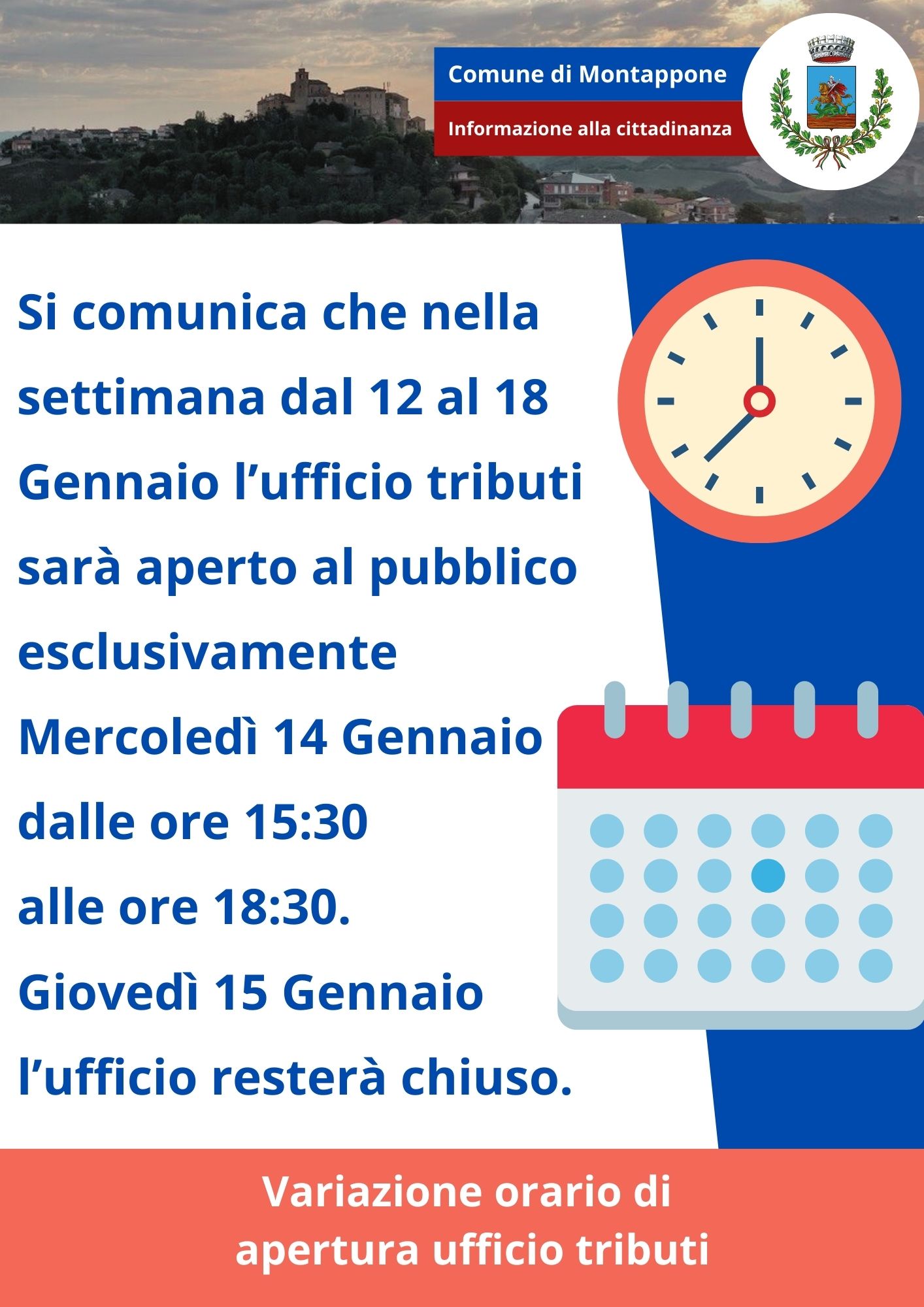 Si comunica che nella settimana dal 12 al 18 Gennaio 2026 l'Ufficio Tributi sarà aperto esclusivamente Mercoledì 14 Gennaio 2026 dalle 15:30 alle 18:30.